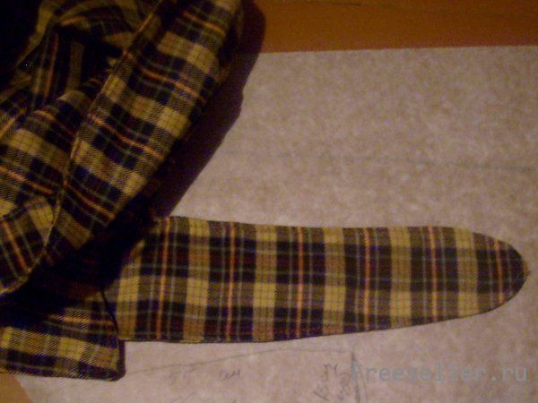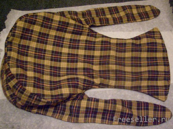 Отметив и совместив точки разделения верха и завязок, сшиваем между собой среднюю часть верха и боковины. С лицевой строны делаем строчку близко ко шву по боковине.