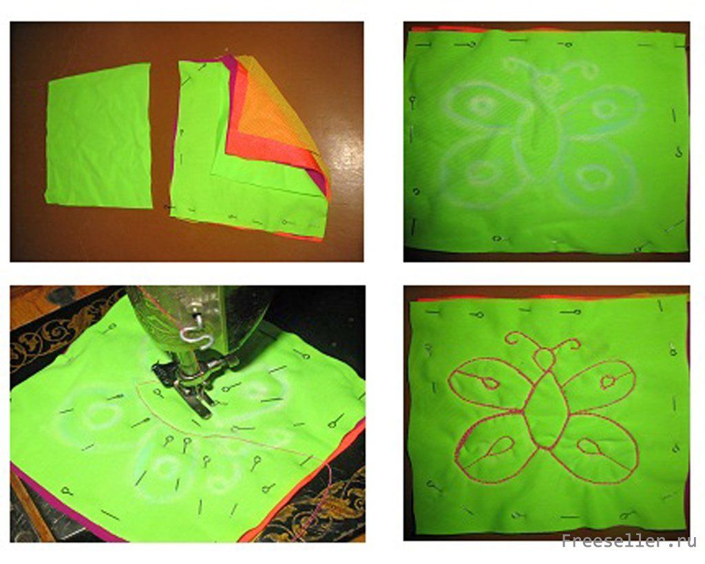 1) Вырезаем квадраты одинаковых размеров из кусочков ткани разных цветов, складываем их стопкой, рисуем картинку, выстрачиваем ее по линиям обычной строчкой 3-4 раза (для надежного закрепления ткани) или зигзагом;