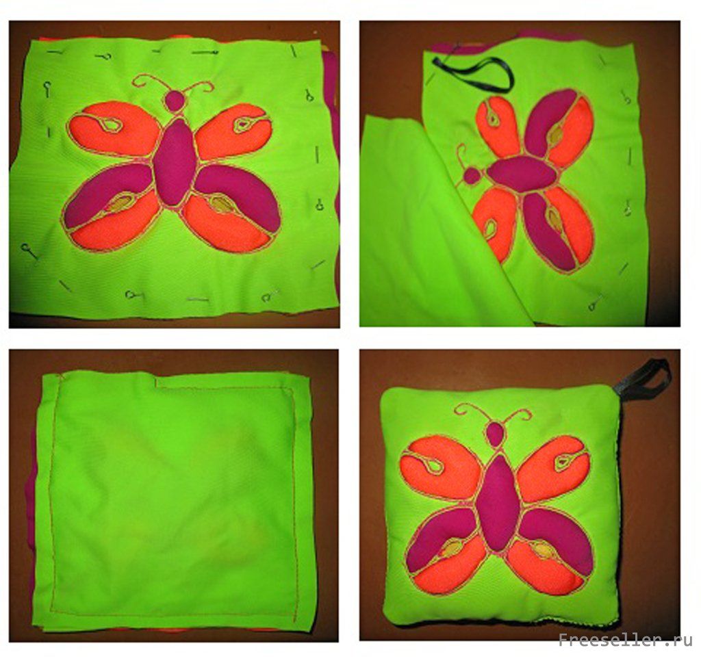 4) Делаем из тесьмы петлю, прикрепляем ее вовнутрь, накладываем на рисунок последний кусочек ткани основного цвета (фона), прострачиваем по контуру, оставляя небольшой промежуток (чтобы изделие можно было потом вывернуть), выворачиваем, набиваем игольницу синтепоном и вручную подшиваем отверстие.