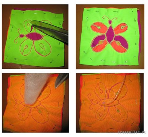 3) Поворачиваем рисунок на обратную сторону, делаем надрезы в тех элементах картинки, которые хотим сделать объёмными, заталкиваем туда синтепон и зашиваем;