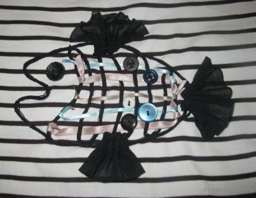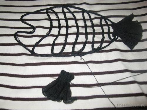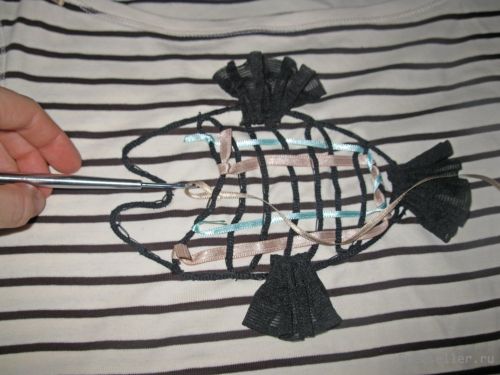 4) Имитируем чешую рыбки тесьмой или лентами, переплетая их "плетенкой" и протягивая между ребрами рыбки с помощью крючка, концы ленточек обвязываем узелком и оставляем торчать, кончики прижигаем (чтобы лента не распускалась при носке);