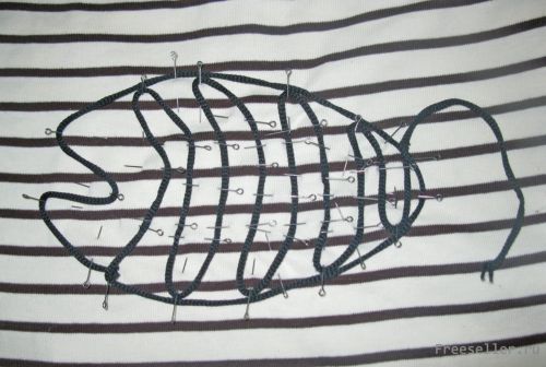 1) На майку выкладываем скелет рисунка с помощью булавок и шнурка, который их обвивает;