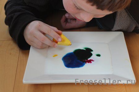 В блюдце наливаем тонким слоем молоко, капаем в желаемом количестве разными красителями в блюдце с молоком.