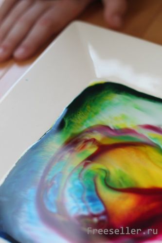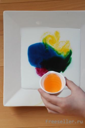 В молоко с красителями добавляем пару капель жидкого мыла и наблюдаем за появляющимися картинками.