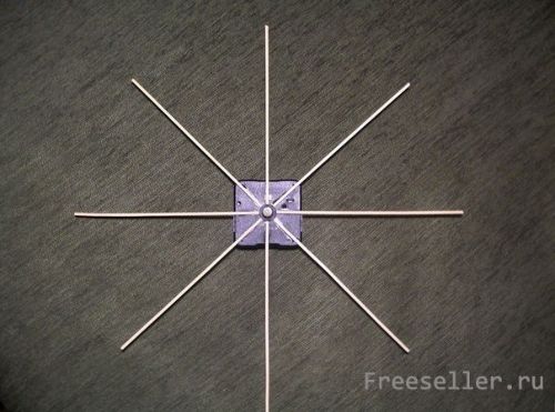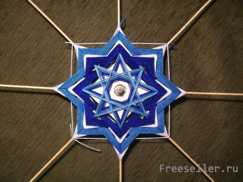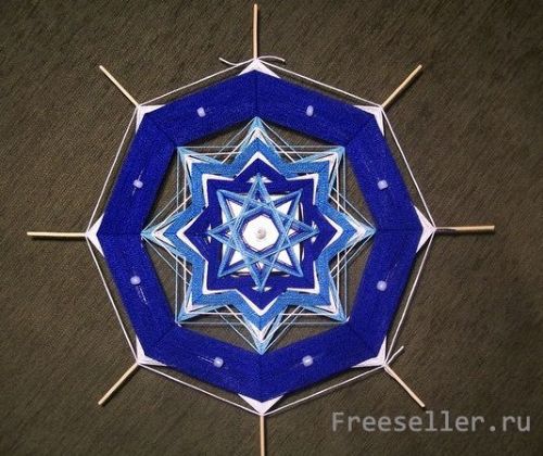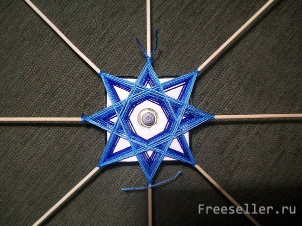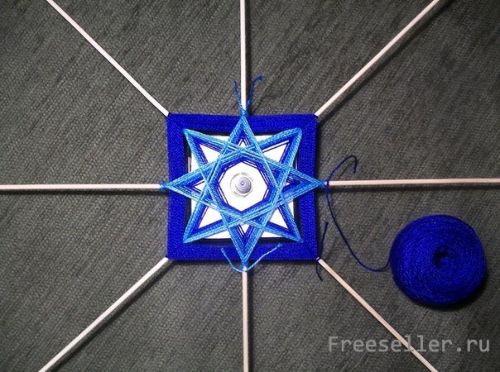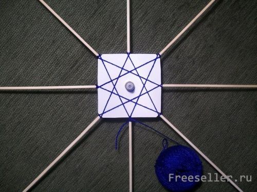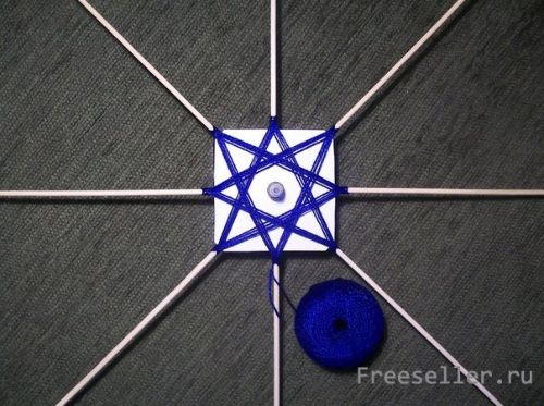 Теперь берем нить и привязываем ее к одной из палочек. Далее начинаем обматывать нитью квадрат (делается это по диагонали через каждые две палочки). Все делается до того пока не пройдете по кругу и не дойдете до той палочки от которой все начали делать.