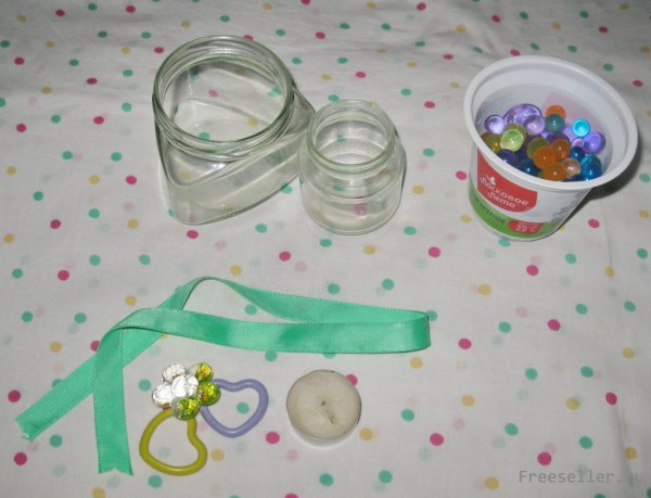 Делаем своими руками самодельный красивый подсвечник из банок, водяных шариков для цветов и ленты за 10 минут.
