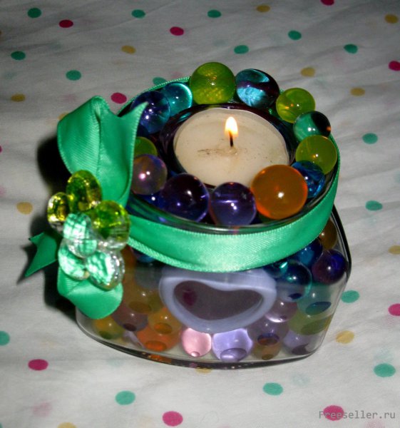 Сделать красивый самодельный подсвечник своими руками так просто. Нужно только желание, немного фантазии и много ненужных, но очень-очень красивых вещей. К ним относятся водяные шарики для цветов, 1 цветочная пуговица и сердечки от поломанной игрушки.