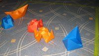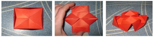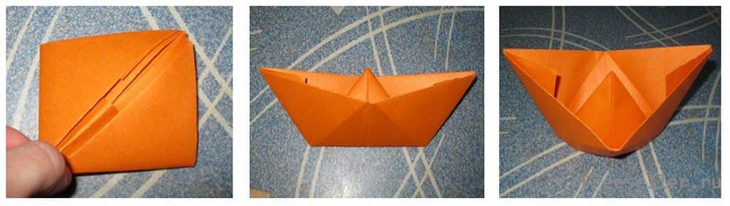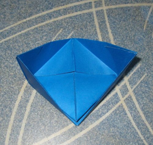 3) делаем кораблик: повторяем полностью пункт 2, кроме опускания вниз перпендикулярного треугольника, - остается торчать, а из развертки делаем борта кораблика, затем дно немного распираем, чтобы он лучше стоял на поверхности - корабль готов (таких тоже нужно сделать несколько штук);