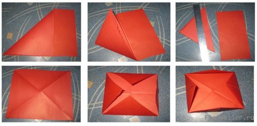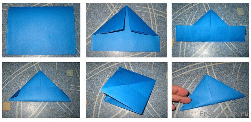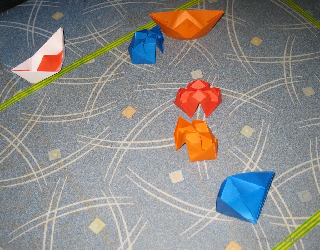 4) делаем двухтрубный корабль: прикладываем по диагонали один конец бумаги к другому, тоже самое в другую сторону - в итоге должен получится квадрат с 2 диагоналями из углов через центр, лишнюю полоску бумаги отрезаем или отрываем при помощи линейки; затем по диагоналям к центру с 4 углов закладываем концы квадрата, переворачиваем и делаем тоже самое, еще раз переворачиваем и опять загибаем; затем делаем 2 трубы друг на против друга, из углов выпрямляем прямоугольники; поднимаем внутренние концы оставшихся углов и разводим в стороны, а трубы соединяем - корабль с трубами готов (тоже делаем несколько штук).