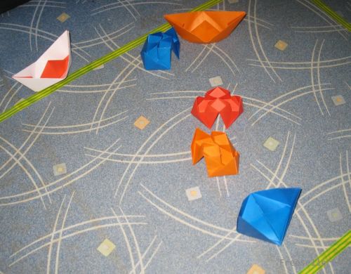 2) делаем чёлн: складываем лист двухсторонней цветной бумаги пополам, затем подворачиваем и загибаем верхние края, чтобы получился треугольник; загибаем наверх оставшиеся полоски, кончики которых подворачиваем за бока треугольника; соединяем бока, образуя квадрат, загибаем наверх отходящие края, получая в итоге треугольник; раздвигаем в стороны сгибы по середине треугольника; треугольник, получившийся внутри (стоит перпендикулярно развертке), опускаем вниз - челн готов (таких нужно сделать из нескольких цветов бумаги - в зависимости от количества игроков);