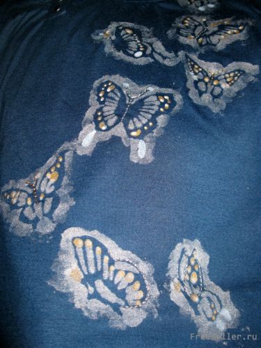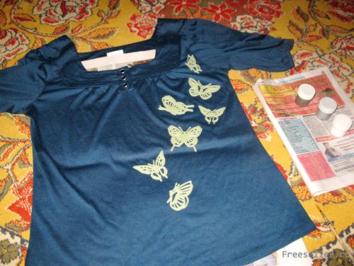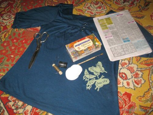 1) внутрь майки кладем газету, раскладываем на лицевой стороне трафареты бабочек (или любые другие имеющиеся в вашем арсенале на весеннюю тему - цветы, птицы, жучки и т.д.);