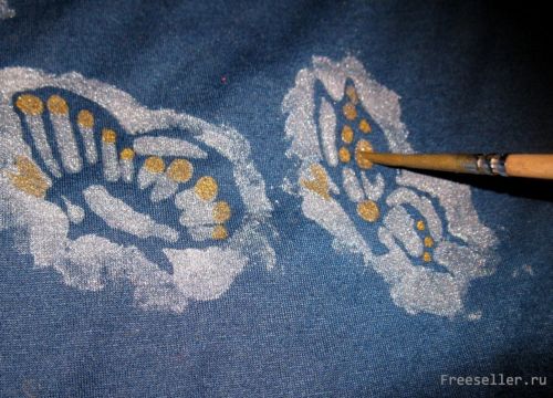 5) даем краске хорошенько просохнуть, затем выворачиваем майку наизнанку и проутюживаем место окраски через газету в течение 3-5 минут, чтобы надолго зафиксировать рисунок на ткани;