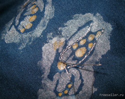 6) вышиваем контуры крылышек или брюшка бабочки тамбурным швом серебристой или золотистой ниткой вручную - делаем только небольшой акцент на рисунке, без тщательной очертания контура (эффект легкого, неуловимого силуэта).