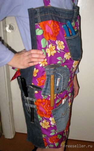 Нет необходимости дома выкладывать все из карманов, потому что фартук легко можно повесить (за шлевки на поясе джинсов) на перекладину для полотенец и сделать из него карман для кухни (чуланчика или гардеробной).