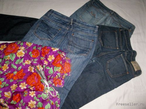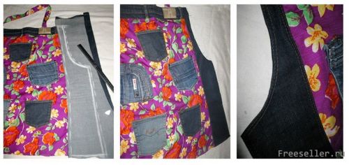 4) распарываем или разрезаем брючину джинсов, из половинок делаем бока фартука - сверху узко, затем плавно расширяем к низу, пристрачиваем бочок к прямоугольнику ткани, подгибаем края и делаем отделочную двойную строчку (как на джинсах) на лицевой стороне;
