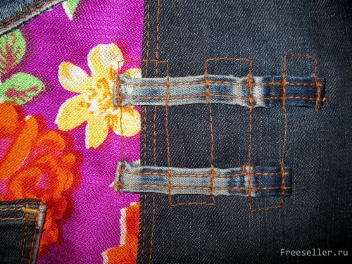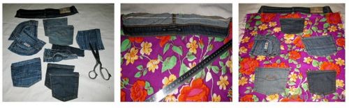 1) отрезаем от джинсов заднюю часть пояса со шлевками, карманы (сверху 1 см припуск - для подгибки края, сам карман - по контуру), шлевки, часть пояса спереди со шлевками;