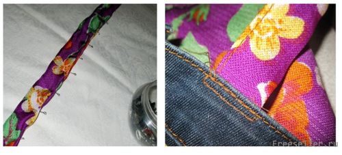 3) вырезаем 3 полоски из пестрой ткани (ширина 6-7 см), закладываем края вовнутрь и прострачиваем завязки для шеи и боков фартука, пришиваем к основе;