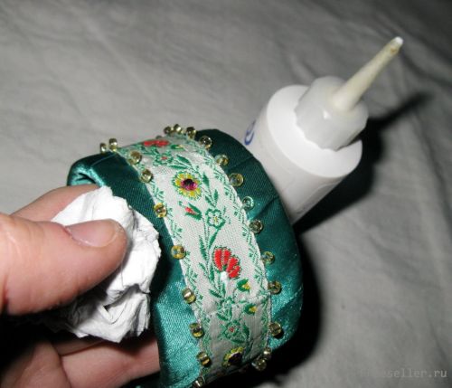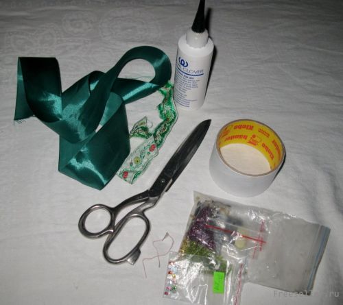 - Бисер (в тон тесьме или ленте);