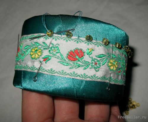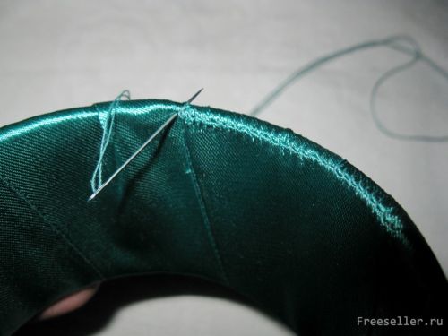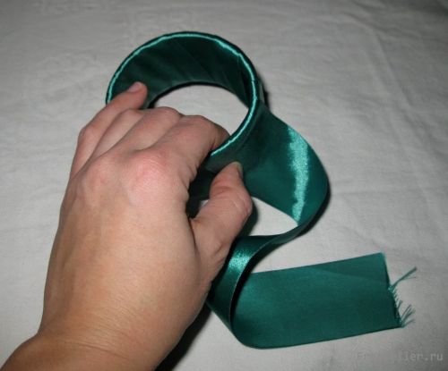 2) конец ленты подгибаем (чтобы не распускался) и закрепляем с внутренней стороны иголкой вручную;