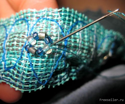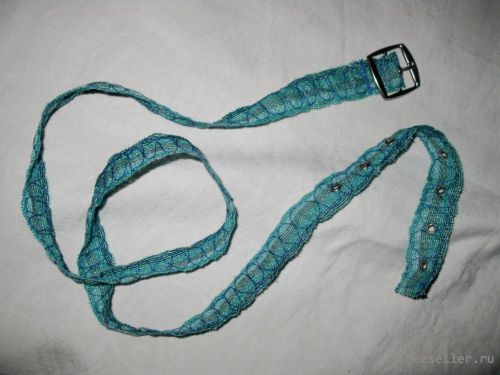 4) вручную вышиваем пояс бисером (кругом, зигзагом, квадратиком, крестом и т.д.), нанизывая элементы на нитку и делая закрепы на поясе.