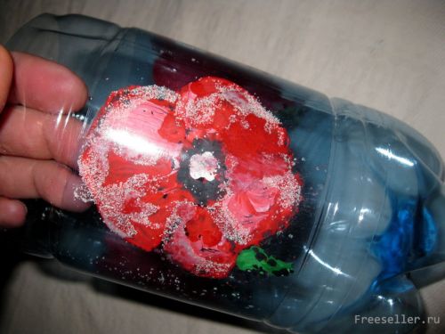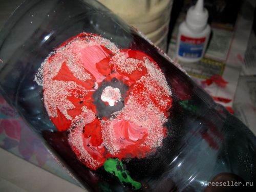 2) наносим цветочный рисунок (например, маки) на широкую полосу между бортами баночки без верха (можно заполнить всю площадь полосы рисунком, а можно сделать только отдельные элементы);