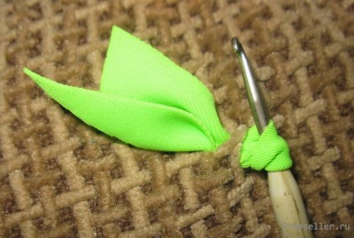 2) продеваем в чехол подушки крючок и протягиваем петлю из полоски ткани, в эту петлю выводим концы - один короткий и другой длинный, который и будем потом использовать в работе;