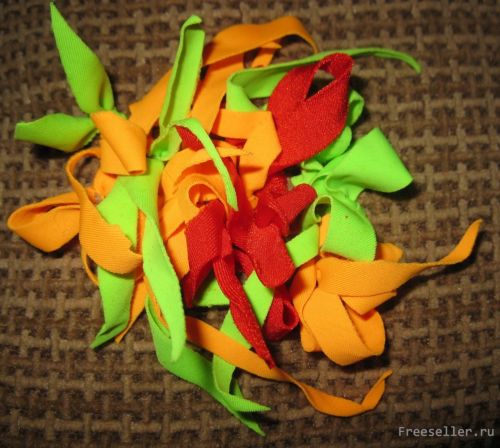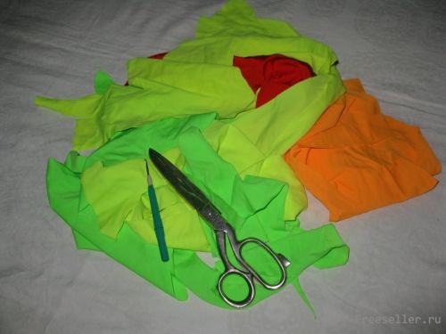 1) нарезаем полоски ткани разных ярких оттенков (ширина - 0,6-1 см, длина может быть разная );