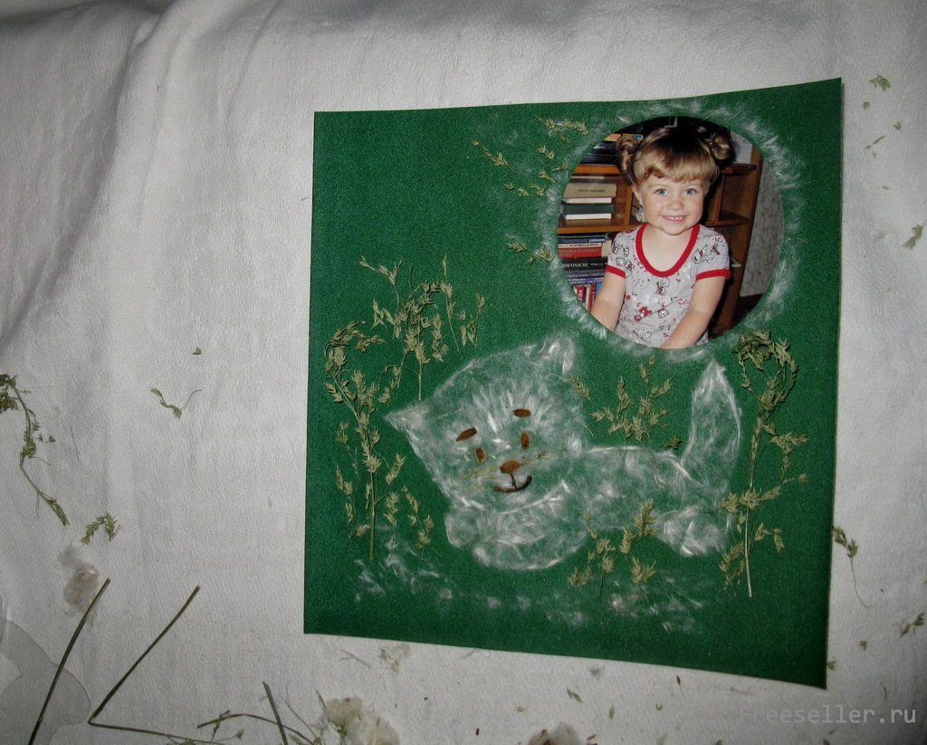 7) приклеиваем фотографию ребенка, которую тоже по контуру украшаем тополиным пухом.