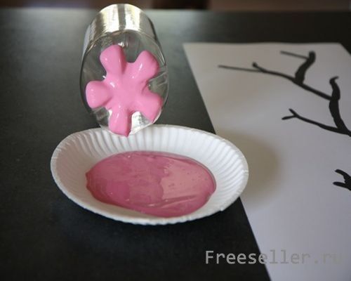 С помощью бутылки аккуратно оставьте следы на бумаге - это цветы сакуры. Дайте рисунку высохнуть. Готово!