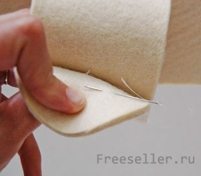 Возьмите заготовку левого тапка, сложите «ушки», наложив одно на другое, иголкой проколите в середине отверстие сквозь «ушки».