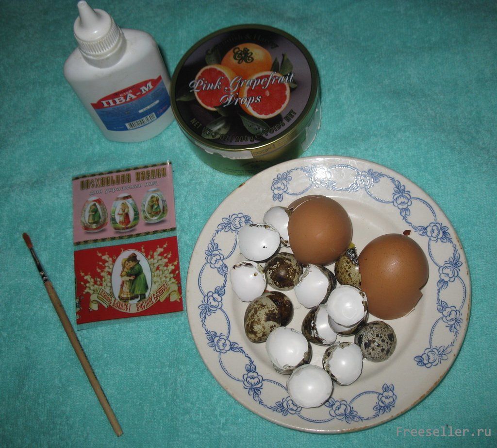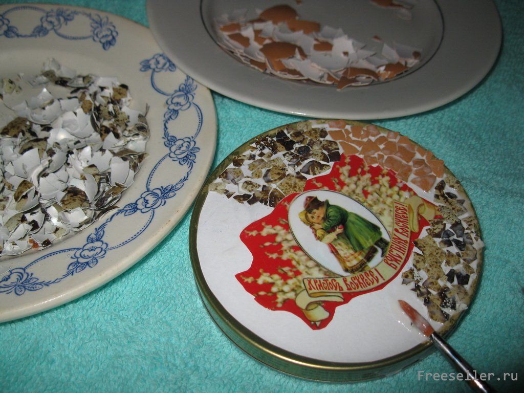 3) даем обсохнуть, затем наносим густой слой белого клея на оставшиеся пустые части коробочки и начинаем их заполнять скорлупой разных цветов (скорлупу от яиц предварительно нужно промыть, просушить и раздробить на мелкие кусочки); накладываем скорлупу на клей и слегка прижимаем пальцем, излишки клея удаляем салфеткой (мелкие кусочки легко подцеплять на обмазанную в клее кисточку).