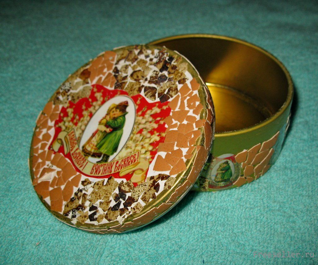 Например, шкатулка-коробочка для мелких вещей, выполненная в технике декупаж из яичной скорлупы и пасхальной пленки.