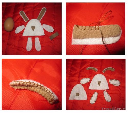1) делаем выкройку предполагаемого зверька: для курочки - 2 заготовки туловища (полуовалы с шириной чуть больше диаметра яйца), 2 крыла, хвост, клюв из сложенной вдвое маленькой полоски-треугольника, 3 небольших полоски для гребешка; для кролика - 2 заготовки туловища, 4 лапы, небольшая полоска - хвостик, нос из сложенной вдвое маленькой полоски-треугольника, 4 заготовки уха (2 - широкие, 2 - узкие);