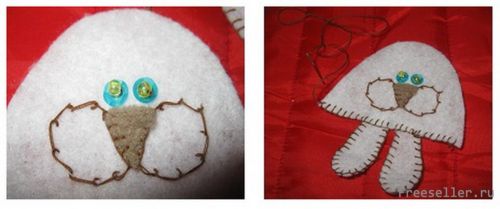 3) делаем украшение мордочки: расшиваем швом, пришиваем паетки и бисер - глазки.