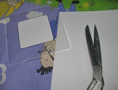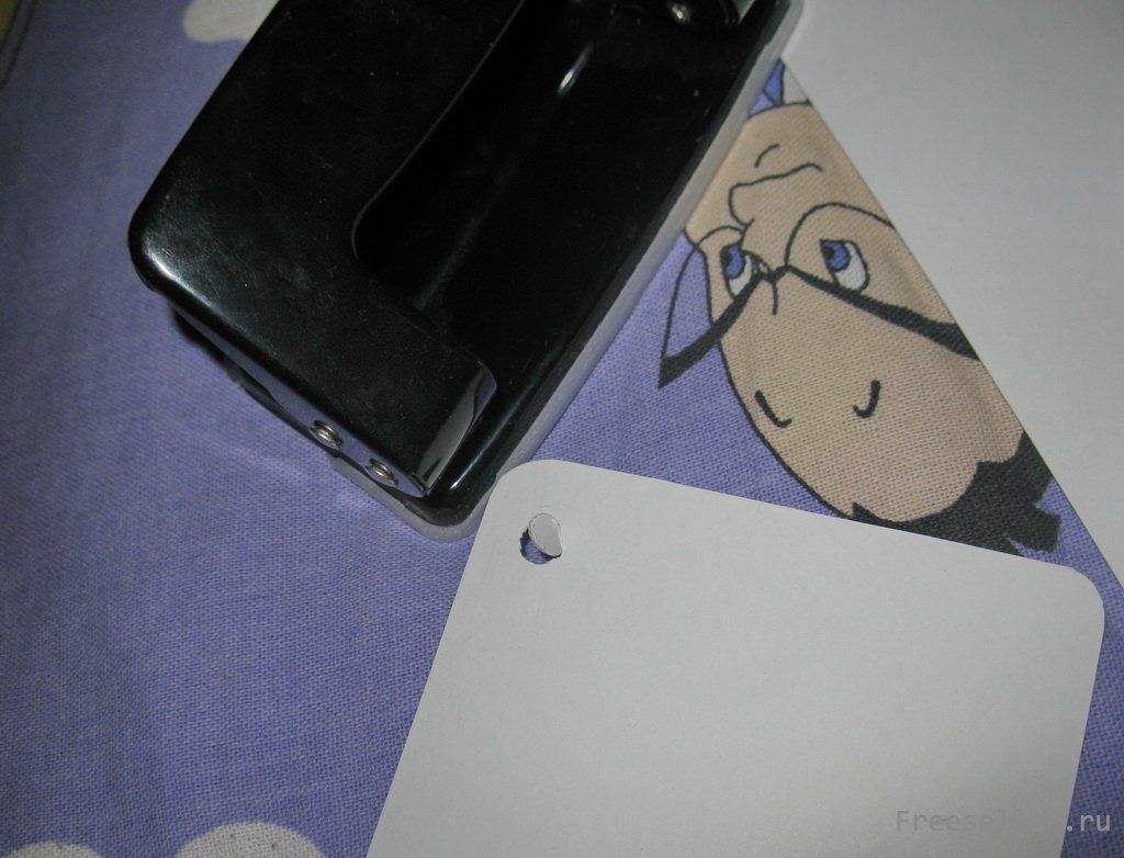 2) из картона вырезаем квадрат с закругленными углами (подгоняем под отверстие в накладке на выключатель) и дыроколом делаем отверстие на 1 из углов;