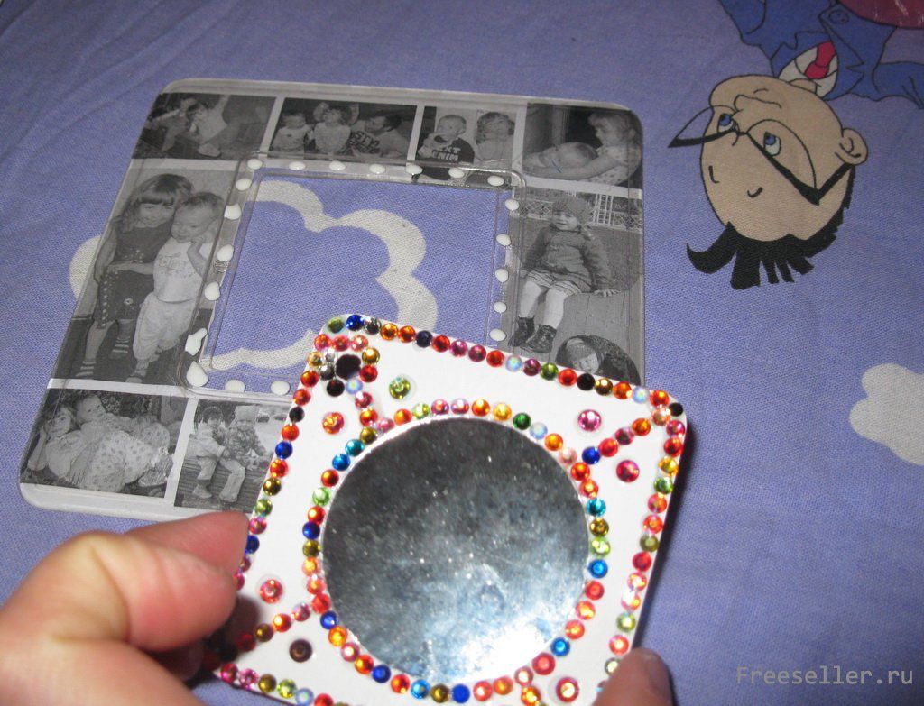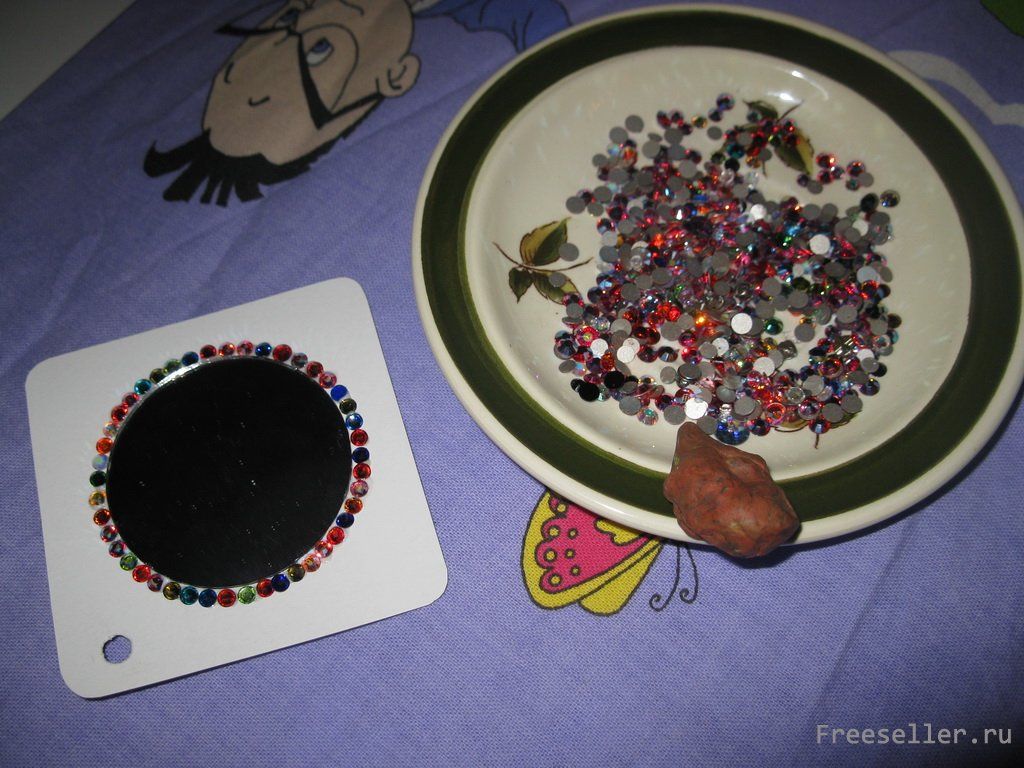 3) в центр квадрата приклеиваем зеркало (клеем для страз или супер-клеем) и украшаем вокруг стразами (целиком или в виде рисунка) - маленький секрет: камешки насаживаем на болванку из пластилина и слегка прижимаем в местах нанесения клея;
