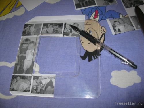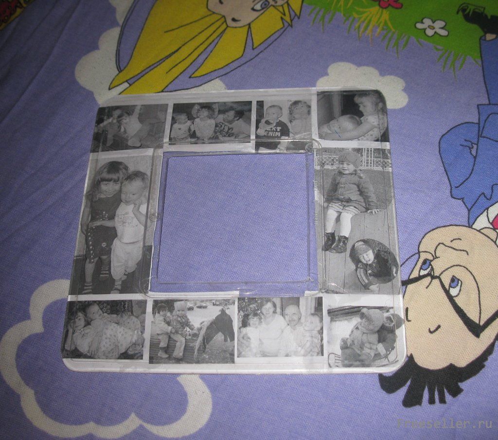 1) подгоняем под рамку - накладку на выключатель - фотоколлаж (сделать его можно в ворде: вставить таблицу на 4 колонки и заполнить фотографиями, между ними оставлять белые поля, убрать границы таблицы и распечатать), вырезаем, промазываем клеем ПВА лицевую сторону фотографий (если белый клей слишком жидкий, то по краям капаем клей для страз, чтобы картинка лучше держалась после высыхания) и приклеиваем на рамку;