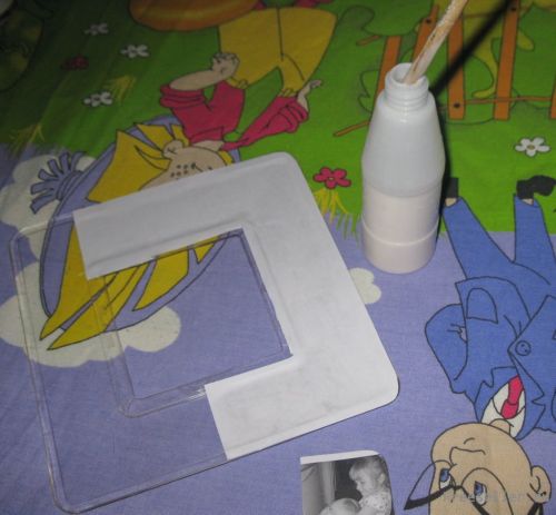 4) даем просохнуть, затем наносим клей на срез внутри накладки и прикрепляем по центру картонку с зеркалом (дырочка должна быть в 1 из верхних углов рамки, чтобы фотографии были не перевернуты);