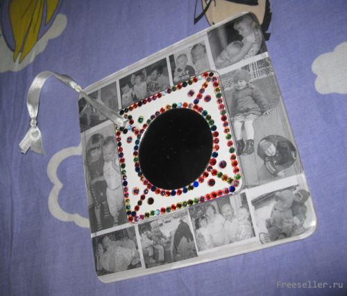 5) протягиваем в отверстие ленточку, завязываем узел и получается красивое подвесное зеркало в фоторамке с семейными фотографиями.
