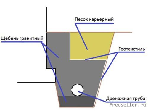 Последний этап дренажа фундамента – засыпные работы мы также производим вручную. Для этого поверх труд укладывается слой гранитного щебня, его высота должна составлять не менее 30 сантиметров, а со стороны стены дома слой щебня при помощи подручных средств выводится вровень с землей. Щебень застилается геотекстилем, который будет служить изоляционным слоем между песком и щебнем, что предотвратит возможность их смешивания. Далее траншея засыпается карьерным песком до самого верха. Не рекомендуется трамбовать песок, что может нарушить его пропускную способность и стать препятствием прохождению поверхностных вод сквозь его слой. Устройство дренажа фундамента на этом можно считать законченным процессом.