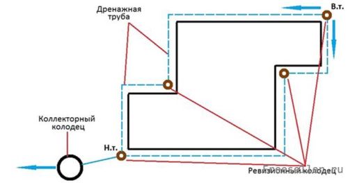 Дренаж фундамента, этап второй – прокладка дренажных труб, их монтаж и устройство смотровых и коллекторного колодцев.