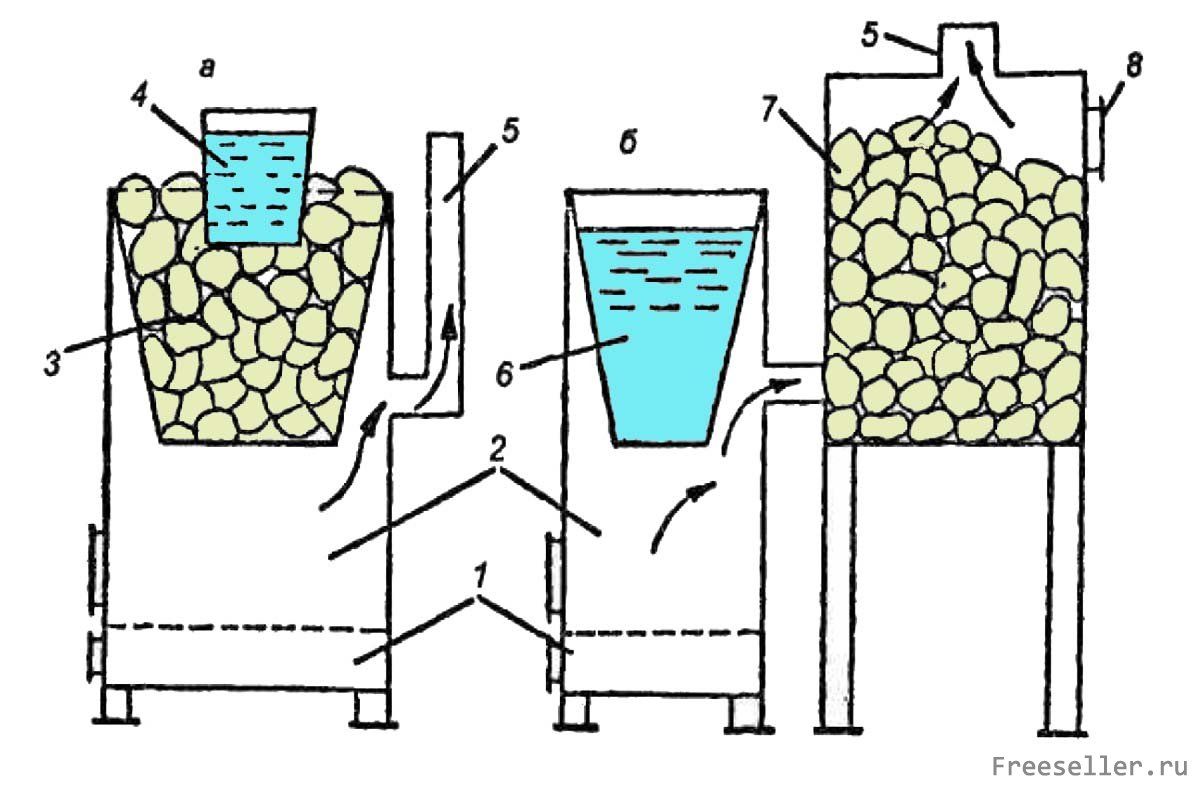- каменка непрерывного действия; б - каменка периодического действия: 1 - зольник; 2 - топливник печки-прачки; 3 - бак, заполненный камнями; 4 - ведро с водой; 5 - выходной дымоход; 6 - бак с водой; 7 - бочка, заполненная камнями; 8 - дверка для пара.