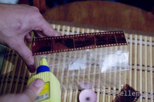 Приклеиваем на бутылку плёночные негативы. Сверху кисточкой ещё раз промазываем клеем.