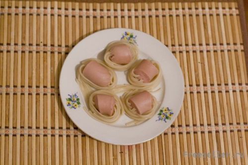 Вторую сосиску режем на кусочки, вставляем в нее макаронины. Варим.