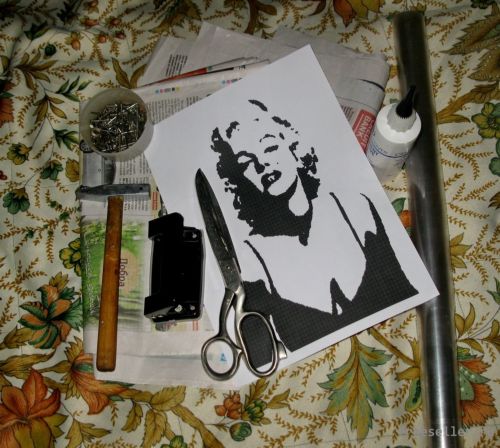 2) кладем на фанеру или твердую плоскую поверхность заготовку рисунка (подбираем по вкусу в интернете силуэт и распечатываем в черно-белом варианте), покрываем картинку пленкой, которую прижимаем грузиками (любыми тяжелыми предметами), чтобы рисунок не сдвигался;