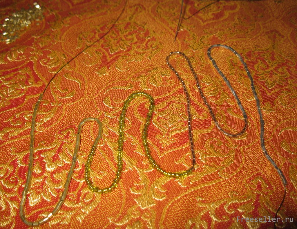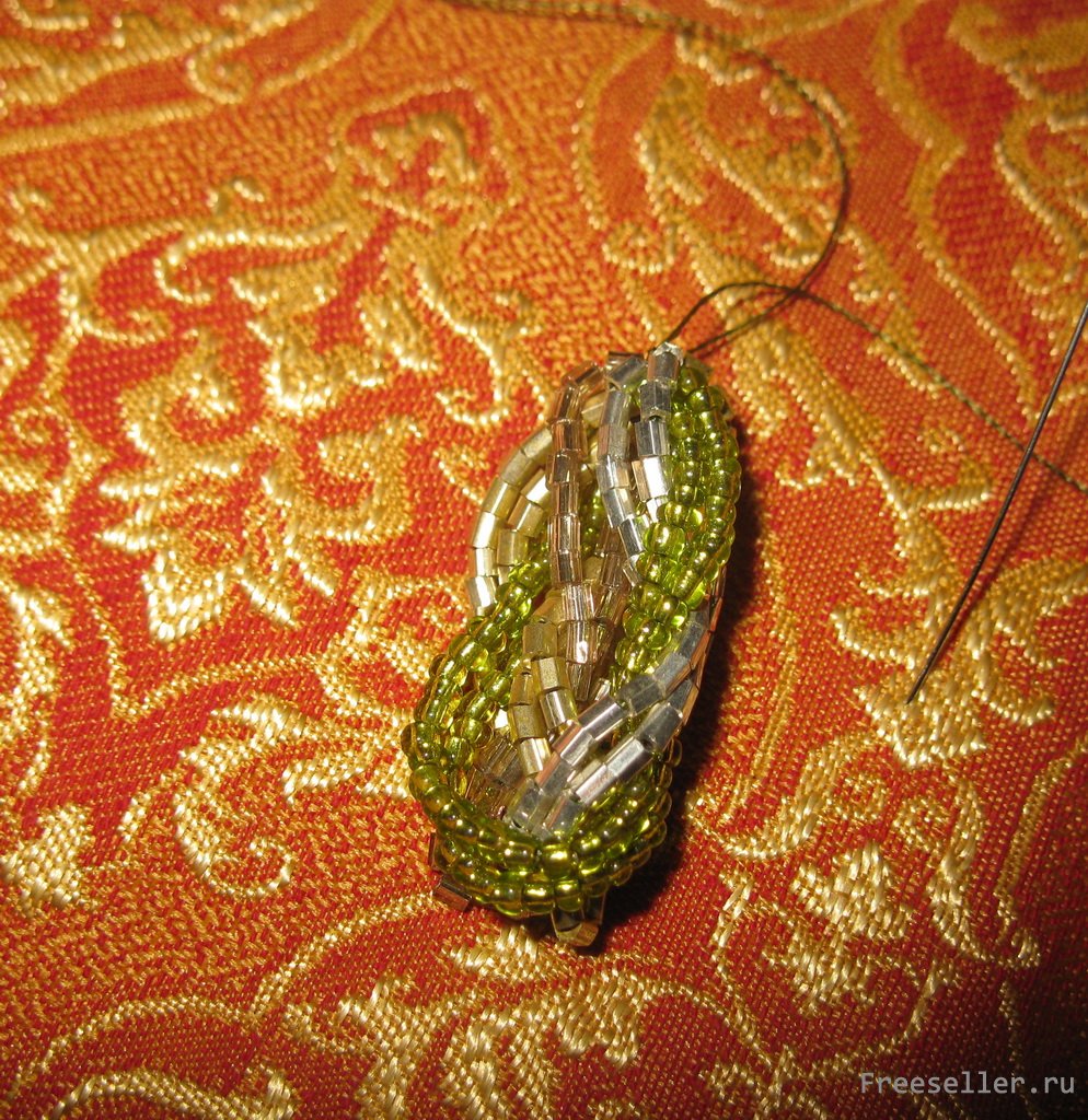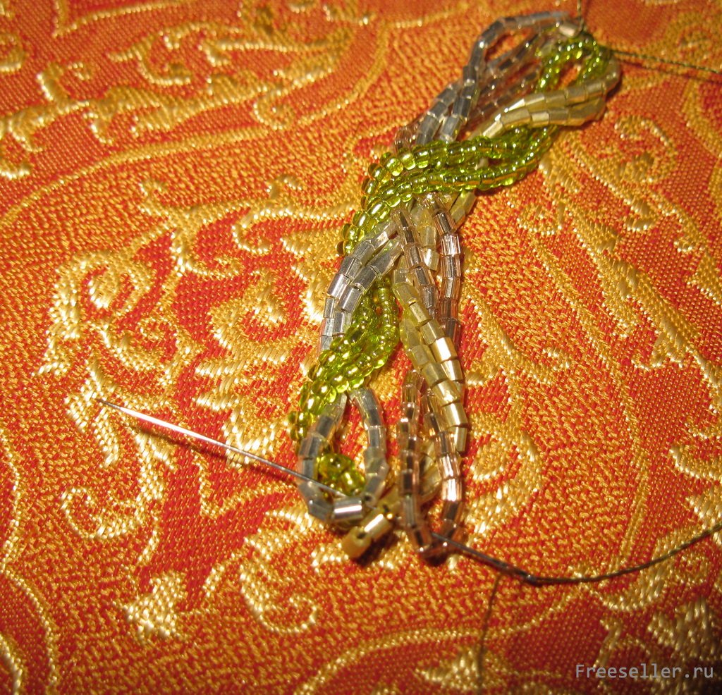 пронизываем ее в цепочку с бисером и фиксируем узлом, концы прячем в ту же цепочку.