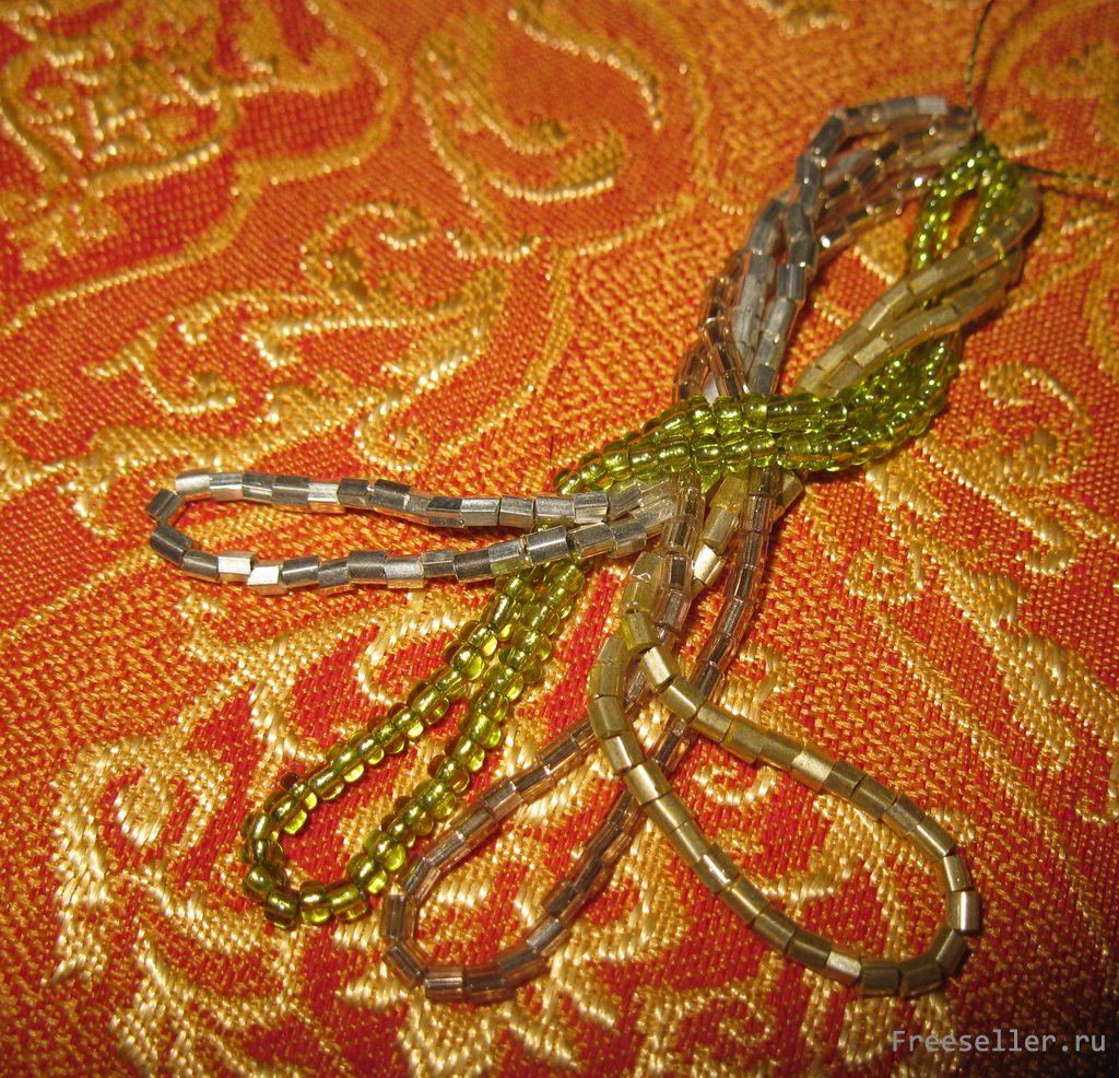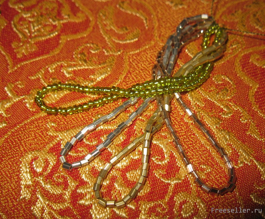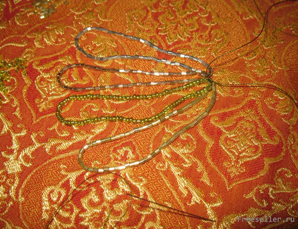 2) собираем бисер каждого цвета в петлю и фиксируем ее обычным узлом, и так 4 раза, все петли собраны в пучок с одной стороны;