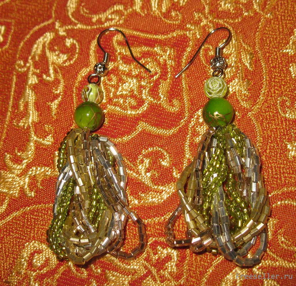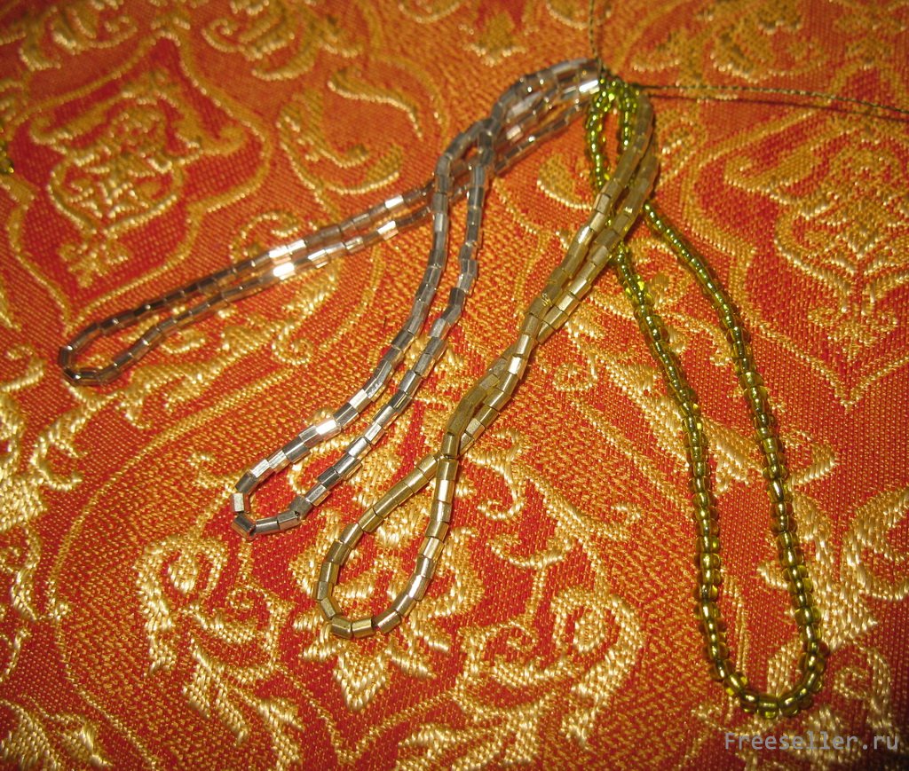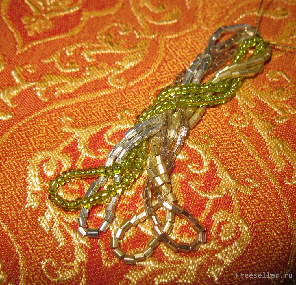 1) нанизываем на нитку бисер или стеклярус (для средней длины сережек понадобятся приблизительно 70 штук) 4 цветов последовательно, друг за другом;
