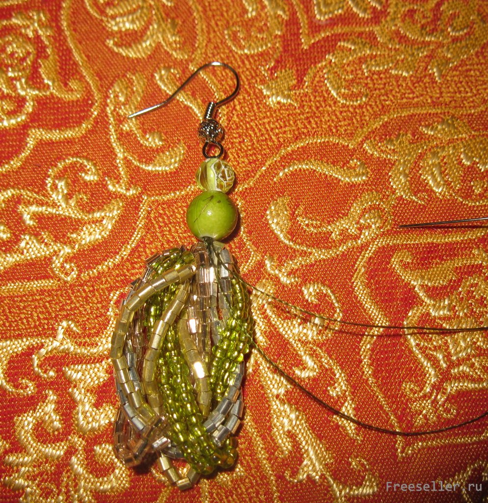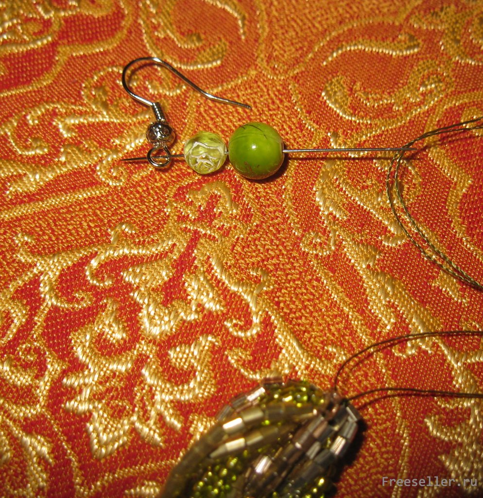 5) надеваем на нить бусины и заготовку для сережки, возвращаем иглу в обратном направлении,