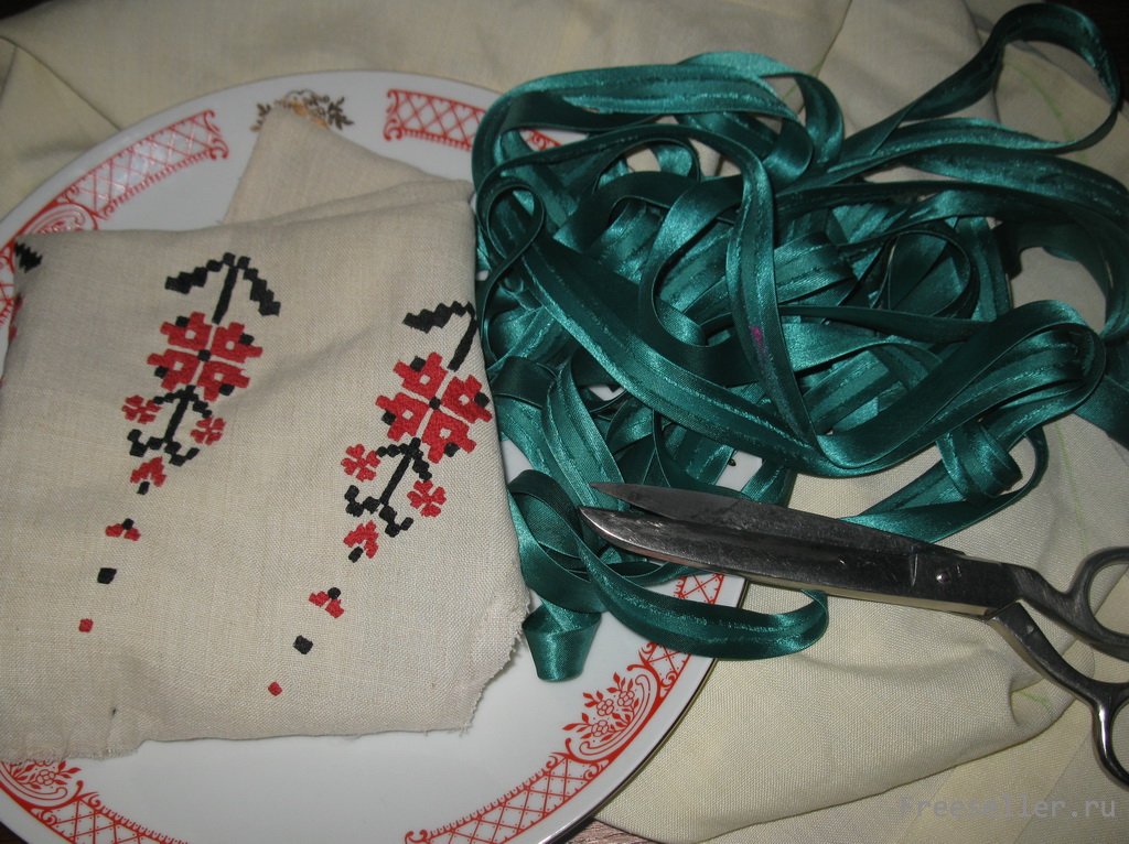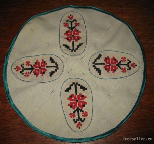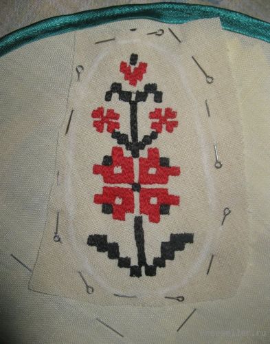 3) на 3 круге делаем аппликации с использованием готовой вышивки: вырезаем кусочки ткани с вышивкой, прикалываем булавками к основе, отмечаем мелом место отстрочки и обшиваем картинку по кругу несколько раз (5-6), чтобы ткань не распускалась (другие варианты - кусочки можно предварительно обверлочить либо прострочить зигзагом), затем аккуратно подрезаем края заготовок;